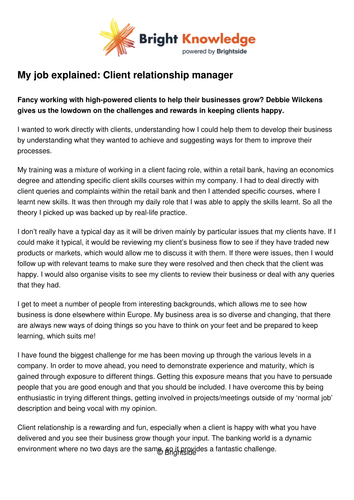 Job description, duties and requirements found the articles, information, and resources on this page helpful. Client relationship managers work with senior executives, sales managers, technical managers, finance directors, and others who make or influence sales decisions. Post on job boards for free. A client relationship manager, crm, is responsible for building and establishing positive relationships between a company and its clients. I put handle in quotes because most of the time they are handling only the tough or tricky situations.